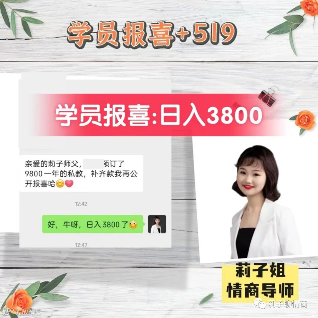 欢迎添加下方👇🏻莉子姐的微信,回复暗号:我渴望成长,免费赠送你价值1699的《高情商成交变现秘笈》,助你开口来财。