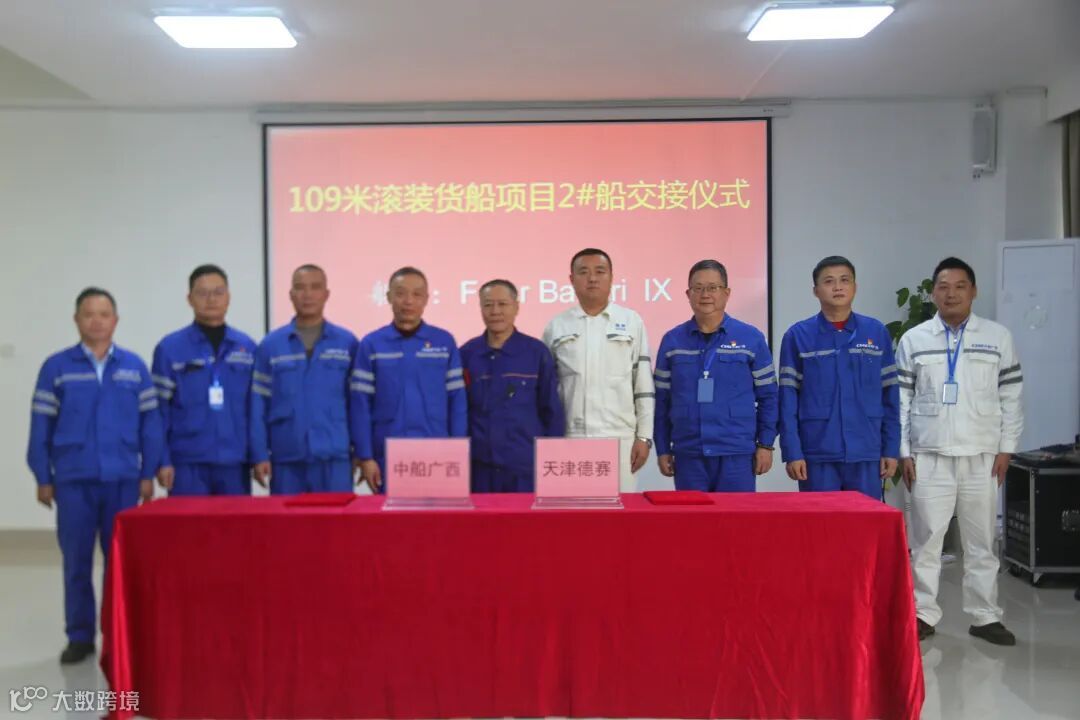 近日,由中国船舶集团广西造船有限公司承建的109米滚装货船2#船签约交船,标志着2024年该系列船舶建造任务圆满收官。