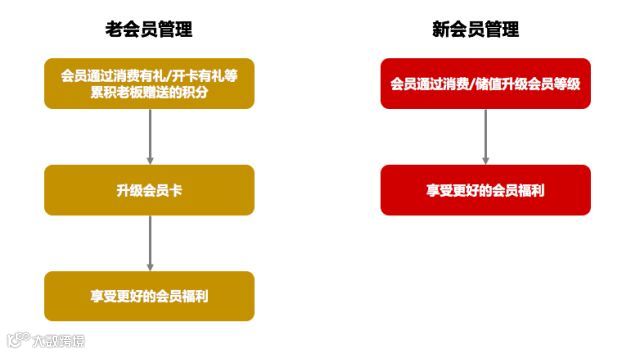 新会员管理系统在使用规则上和老会员系统存在比较大的区别,很多老板一下子没琢磨明白,想尝试又有些犹豫,这次用更清晰的图示来对比下区别在哪。