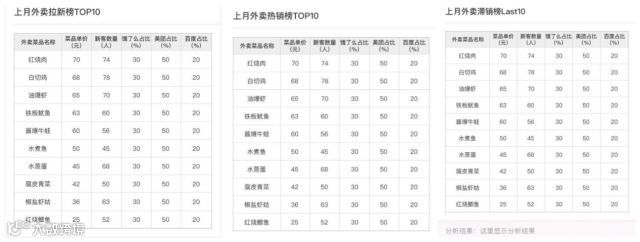 商家可通过上月外卖热销菜和滞销菜及拉新报表了解哪些菜品比较受外卖市场欢迎,哪些菜品可能不适合做外卖,或者需要在包装、制作工艺等方面做适当的改进。报表不仅仅将提供不同模块中的菜品排行,还会根据外卖市场总体情况给予商家精准详细的结果分析供商家参考,商家可根据分析结果对外卖菜品进行相关的调整措施。