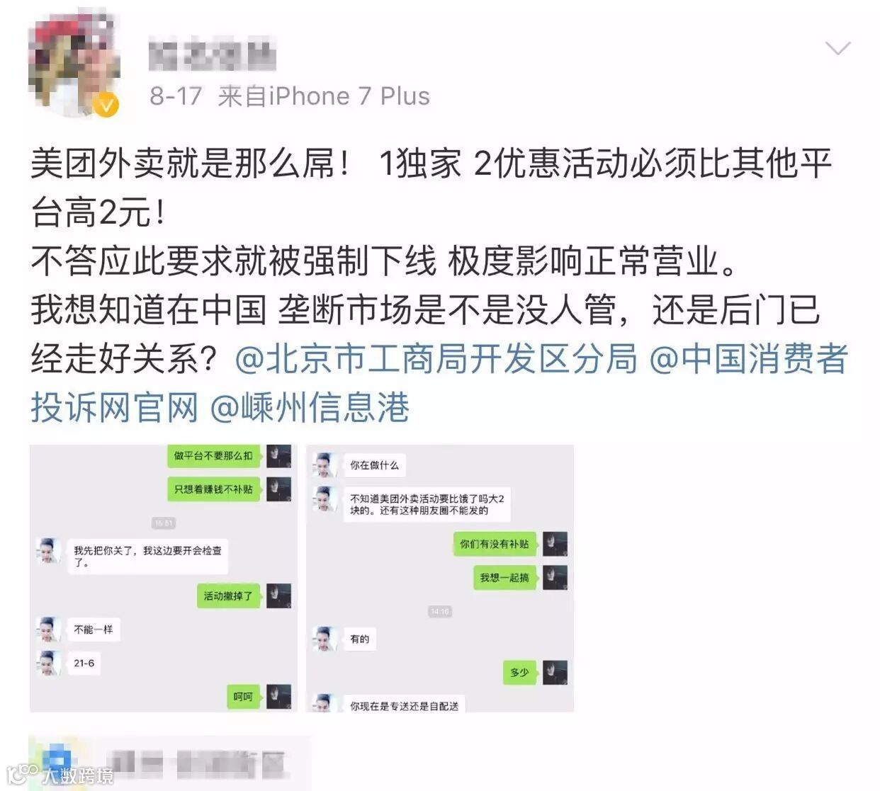 对于这种强盗逻辑,不禁让人打上一个大大的问号:商户的外卖订单信息,传送到商户自己的收银机上,怎么就成了威胁商户信息安全的数据外泄了呢?拿着商户自己外卖订单的数据,干涉商家户的自主选择权才是无耻的绑架。