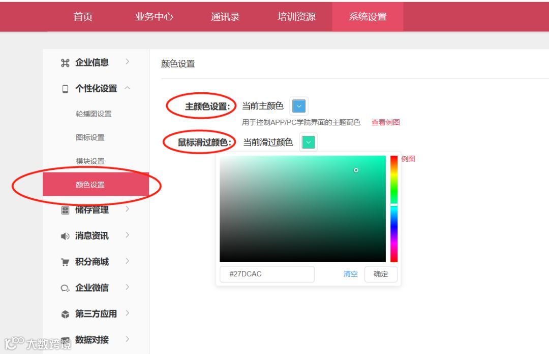 管理员在魔学院后台点击“系统设置-个性化设置-颜色设置”就可以自由选择APP/PC学院界面的主题配色和鼠标滑过的颜色了,So Easy。