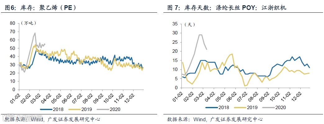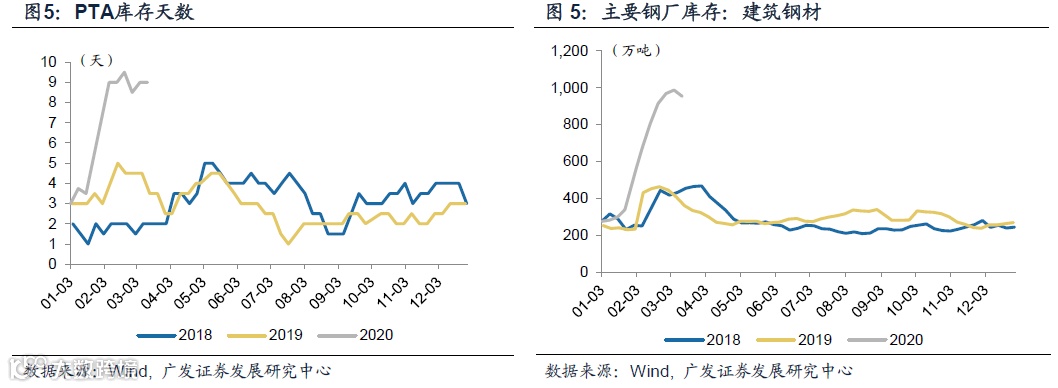 目前我们还缺乏对于劳动密集型行业景气度的跟踪指标,但工业原材料库存数据可以作为一个参考。很多资本密集型企业的产能(如高炉等)启动与关停需要成本,因此供给相对刚性,高炉开工率一直没有出现显著下滑就是一个例证。那么这部分相对刚性的供给是否得到下游的消化,则需要跟踪产品库存指标来进行印证。从年初至今的数据来看,多数工业品库存较去年同期大幅上升,如钢铁行业的螺纹钢、板材,化工行业的聚丙烯、PTA、钾肥、石蜡、沥青、聚乙烯,纺织与造纸行业的涤纶长丝和纸浆等,之所以出现这种现象,是由于产业链各个环节之间的景气度并不匹配,偏下游的劳动密集型行业复工进度偏于缓慢,收缩的下游需求无法消化相对正常运转的上游供给。当然,对于化工品来说,油价下跌也是产业链条景气度下降的重要原因。