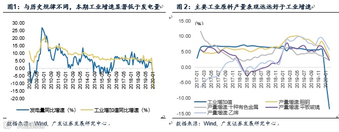 疫情防控对春节后复工形成显著拖累,由于各个地区、不同行业、大中小规模企业各自的具体情况不同,很难对复工率进行准确的量化测算,但大致可以确定,劳动密集型企业复工要明显晚于资本密集型。正因如此,从1-2月经济数据来看,原材料行业的生产情况相对最为理想,在工业增加值增速-13.5%、用电量增速-8.2%的情形下,粗钢、十种有色金属、玻璃、乙烯等分别实现了3.1%、2.2%、2.3%、5.6%的同比正增长。这些资本密集型行业的高耗能特性在很大程度上支撑了用电需求,但用电情况很难反映劳动密集行业的实际景气情况。这也是发电指标与工业增长指标出现背离的根本原因。