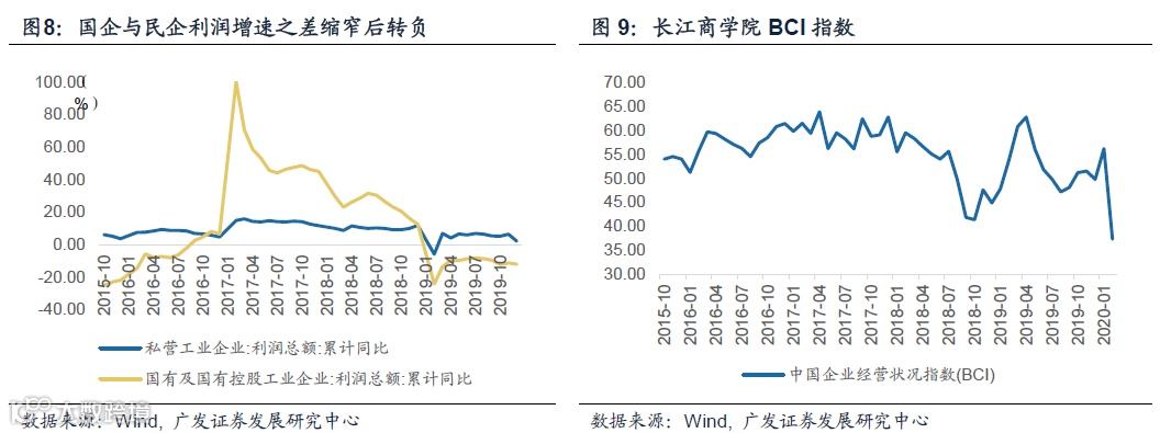 2016年至今,中小企业的经营状况经历了三个阶段的变化。第一阶段是2016-2018H1的供给侧改革时期,政策促进上游集中度提升,导致下游行业在市场化作用下集中度被动提升,叠加金融去杠杆的融资政策,中小企业生存出现困难。第二阶段是边际好转的2018H2-2019年,政策由去杠杆逐步转向稳增长与稳杠杆,供给侧政策边际上也不再进一步收紧,中小企业经营状况逐步得到改善,2018年国有企业与私营企业利润增速之差逐渐缩窄,2019则全年转负。以民营中小企业为主要调查样本的长江商学院BCI指数在2019下半年持续回升,今年1月份为56.2,受疫情影响,2月则回落到37.3%。这表明在疫情发生之前,中小企业的景气度好转是经济中相对乐观的因素,而进入疫情成为经济主导变量的第三阶段,集中在下游消费类、出口类行业的多数中小企业在疫情冲击下直接受到需求端、生产端、成本端的三重压力,经营状况变差,如1-2月工业增加值数据显示私营企业增速(-20.2%)显著低于国有企业(-7.9%),即使在疫情冲击结束之后,短期内可能也难以恢复到原有的增长水平。因此中小企业的经营状况可能是未来经济关键点之一。我们在《需求缺口、固定资产投资与新老基建》中指出,缓解中小企业经营压力,需要减税降费、降低融资成本等供给端的政策配合,但这部分对利润的影响有限,需求的弹性仍然是整个链条上的根本。所以稳就业、稳预期,前提是稳定社会总需求。