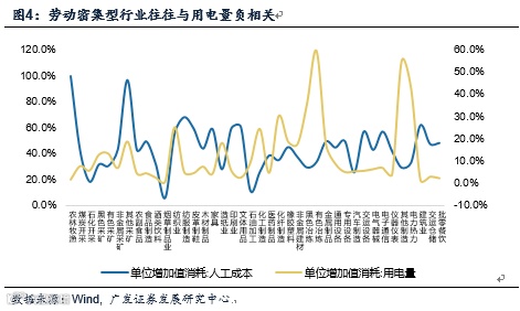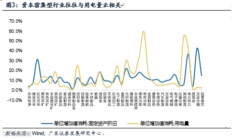 结合各行业增加值创造能力与用电量的关系,可以看到生产过程中所创造的单位增加值耗电越高,往往更倾向于具有资本密集特征,耗电比较低的则更偏向于劳动密集型。例如食品类、日用品类等14个消费品行业,创造的增加值在全部工业增加值中占比26.4%,但用电量占比仅为整个工业用电量的13.8%;而金属冶炼、石油化工等5个原材料类行业,创造了整个工业25.3%的增加值,却消耗了44.4%的用电量。