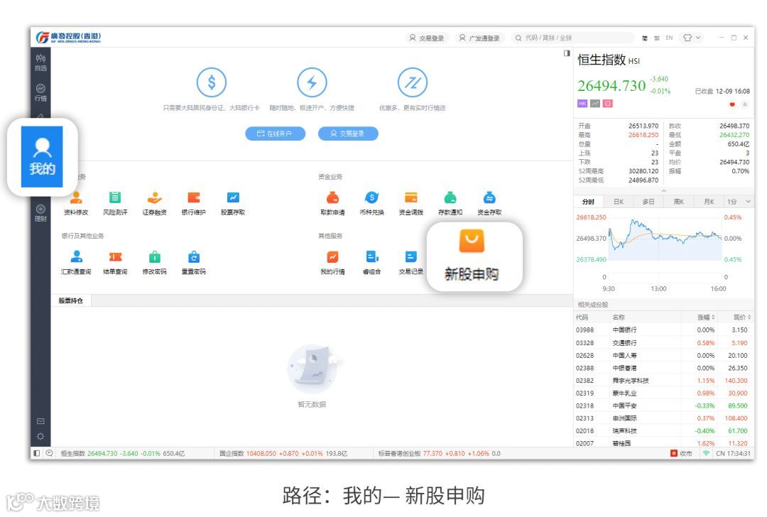 打开“广发证券国际版”PC端,点击左边“我的”菜单,再点击交易菜单页内的“新股申购”,具体操作如下图所示: