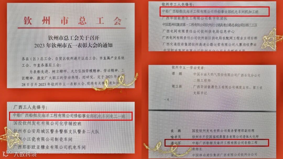 4月28日,广西钦州市总工会召开2023年钦州市五一表彰大会,中国船舶集团广西公司修船事业部机电车间电工一班荣获得“广西工人先锋号”、修船事业部机电车间机加工班荣获“钦州市工人先锋号”、造船事业部潘文军获得钦州市“五一劳动奖章”。