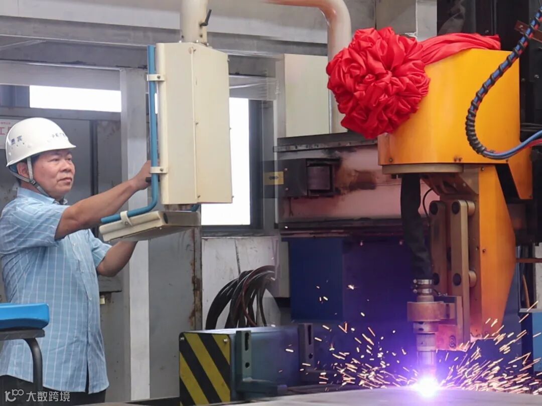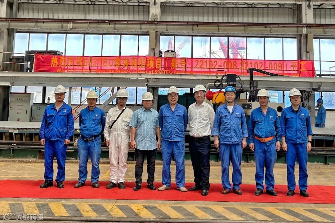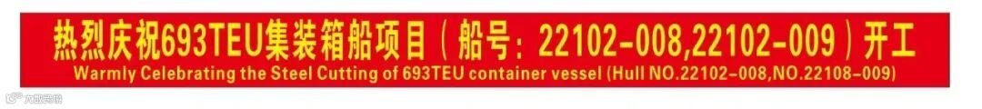 船东代表按下数控切割点火按钮,等离子切割机下火花飞溅,两艘693TEU集装箱船正式开工。