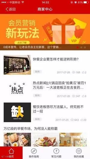 火掌柜中的“商家中心”会随时更新业内动态资讯,让老板时刻了解餐饮发展走势,及时获取最新的业内资讯。