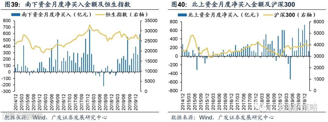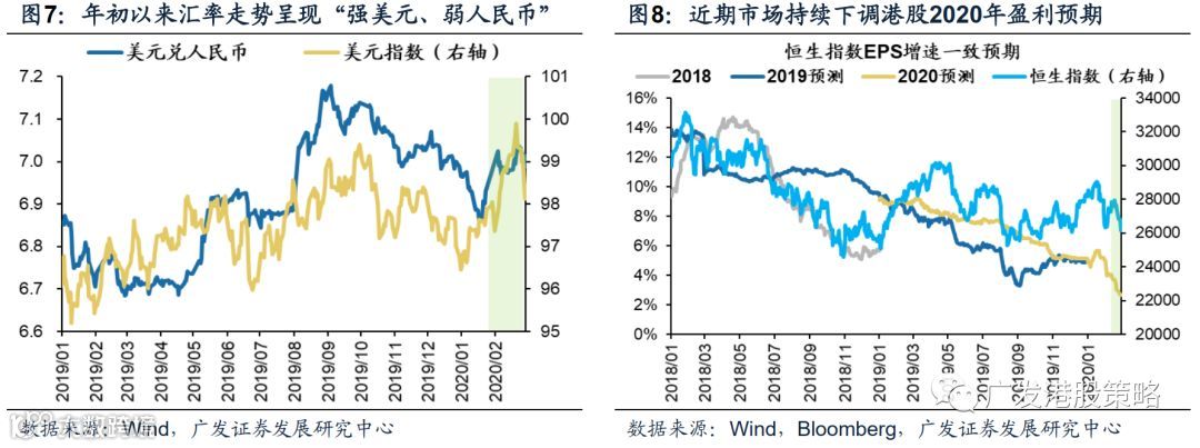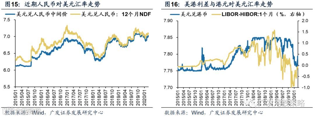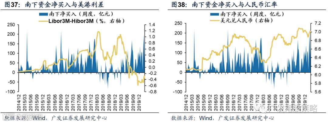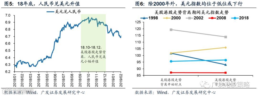 相对稳的人民币是“脱钩”最关键的指标:如08Q4美股下跌,而同期港股大幅上涨近30%,期间人民币汇率保持稳定;18Q4美股大幅下跌,港股未明显下跌,期间人民币兑美元走势小幅升值;