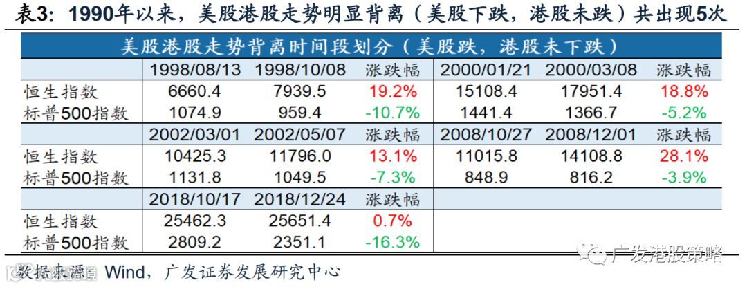 历次美股下跌超10%期间,港股均在某一阶段内出现回撤,但另一方面,港股并非时刻跟随美股下跌节奏,根据我们统计,1990年至今,港股在1998年、2000年、2002年、2008年、2018年曾走出“独立行情”。这意味着即使美股出现“危机式下跌”,港股也存在阶段性入场机会。