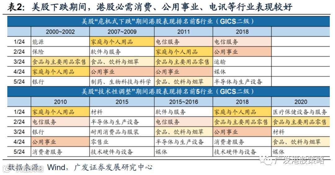 行业层面,美股跌幅差异不影响港股行业表现规律,必需消费(食品饮料、零售、家庭与个人用品)、公用事业、电信服务等板块多跑赢。
