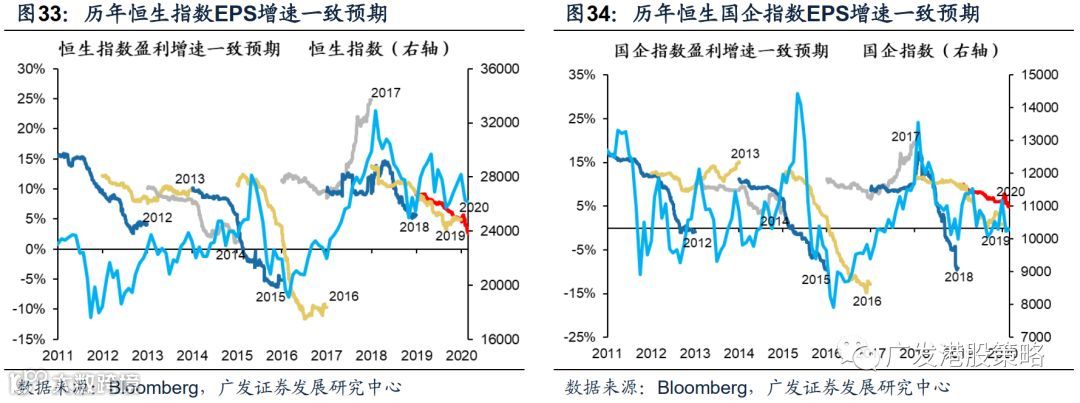 一致预期EPS跟踪:本周(2.24-2.28)彭博对于恒生指数与国企指数20年EPS增速一致预期下调。