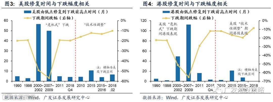 从下跌后影响看,美股与港股具有的共性规律在于,只要不出现2000年“科网泡沫”破裂、2008年全球金融危机等崩盘式下跌,市场从底部修复至下跌前高位不会经历太长时间。
