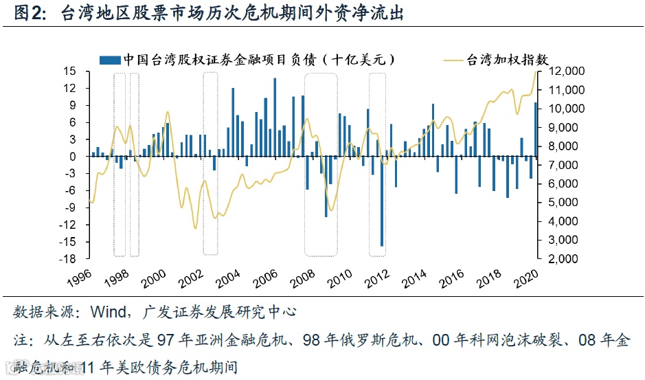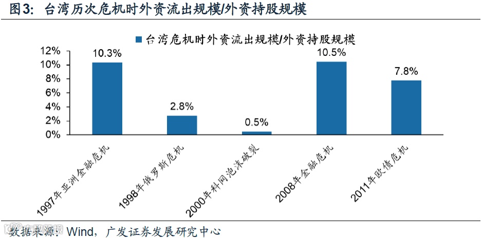 经验2:外资最大流出规模上限约为外资持股规模的10%。中国台湾经验表明,在97年亚洲金融危机和08年全球金融危机中,外资流出台股约为外资持有台股规模的10%;