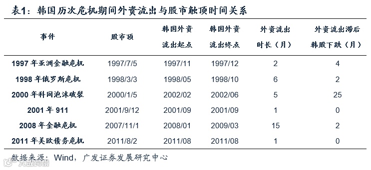 经验1:危机时期外资往往流出,且流出往往滞后于本地股市触顶。韩台经验表明,历次危机期间外资往往呈现净流出态势,危机期间外资流出往往滞后于本地股市触顶时间,滞后期一般为2-4个月;