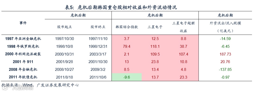 经验2:危机后期即使外资仍流出本地股市,但外资重仓股已走出相对收益。韩国多数危机后期外资仍流出本地股市,但外资重仓股三星电子已经走出相对收益。