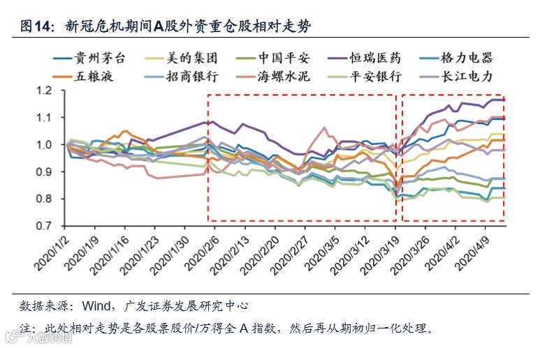 A股外资重仓股走势符合海外经验规律,外资重仓股危机前期相对收益为负,危机后期相对收益为正。本次疫情危机前期受疫情本身影响及海外流动性紧张影响,这一阶段的分水岭大致可定位20年3月19日。主要是考虑到3月18日美联储出台MMLF、AMLF、TALF等各类流动性支持工具。从资本市场表现看,上证综指在3月19日日内触及本阶段最低点,韩国综合指数和台湾加权指数亦在3月19日触及本阶段最低点。因此以20年3月19日为分界点,在此之前视为危机前期,在此之后视为危机后期。截至2020年4月8日,北上资金前十大重仓股是贵州茅台、美的集团、中国平安、恒瑞医药、格力电器、五粮液、招商银行、海螺水泥、平安银行、长江电力。在本次新冠疫情前期(2020年1月1日到2020年3月19日)所有北上资金前十大重仓股的绝对收益和相对收益均为负,相对收益依次分别为-8.92%、-9.68%、-13.76%、-2.85%、-16.41%、-16.34%、-15.12%、-1.71%、-18.76%和-4.10%。在本次新冠疫情后期(2020年3月20日到2020年4月13日)所有北上资金前十大重仓股的绝对收益均为正,相对收益除美的集团外均为正,相对收益分别为14.15%、-1.42%、1.87%、18.97%、4.02%、21.09%、6.70%、12.74%、1.76%和1.40%。
