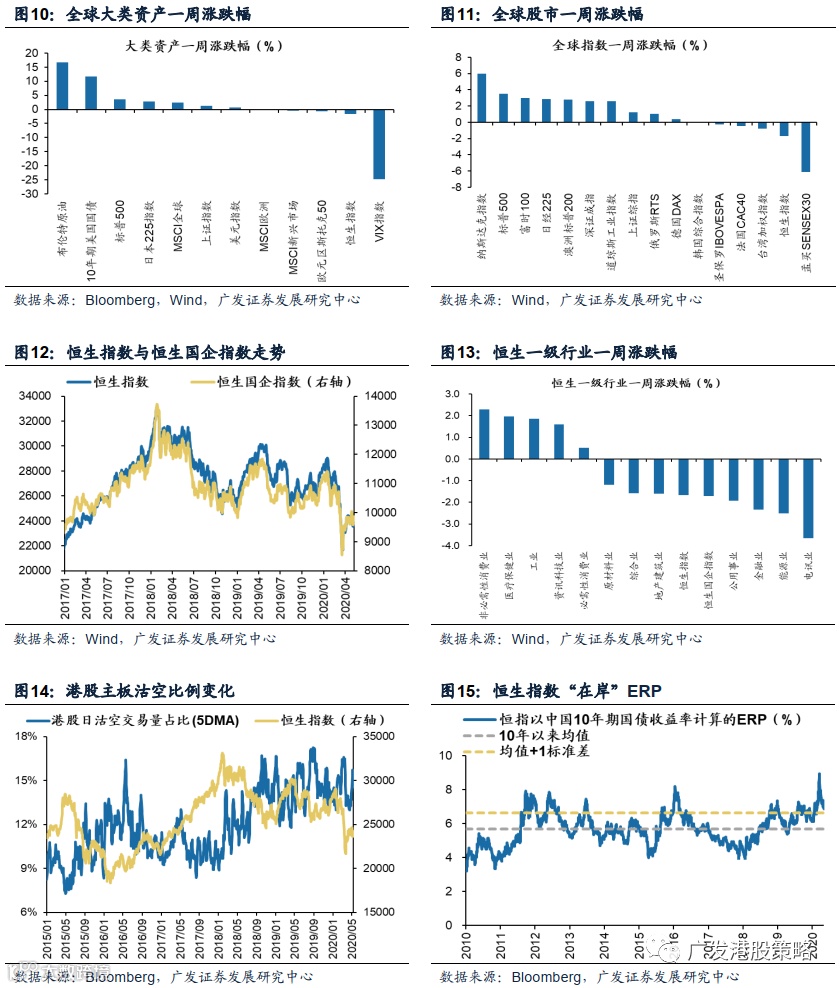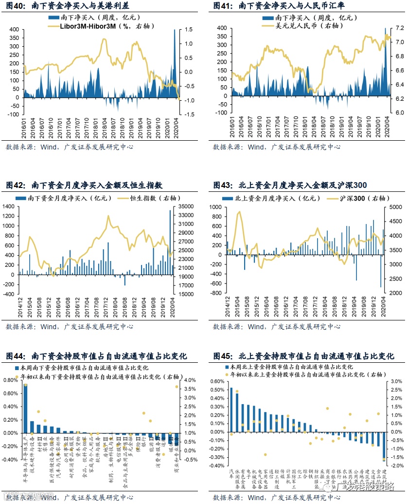 宏观流动性与估值跟踪:本周(5.4-5.8)人民币兑美元汇率贬值,10年期美债利率0.69%,中美利差小幅走阔至193BP。WTI原油价格上涨至24.7美元/桶。恒生指数PE 9.78倍,低于历史均值水平。
