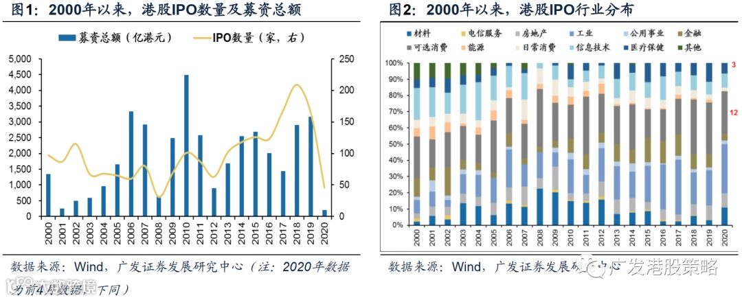 新冠疫情爆发之后,造成内地公司赴港上市数量滑坡,2020年初至今仅有46家IPO。尽管随着国内疫情由“遏制”阶段进入“缓疫”阶段(WHO于4月6日表述),但出于对疫情后的经济前景、企业经营预期不明朗,加上更少的社交场景也延缓了港股上市公司IPO的速率。从热门行业的IPO节奏来看,医药板块最具代表性,2019年共有19家公司赴港上市,但2020年至今仅有3家。