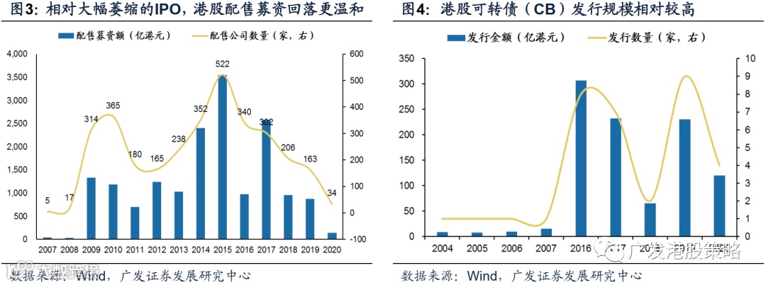 第一,相比疫情下“遇冷”的IPO,港股配股、可转债(CB)等再融资的发行在疫情下遭受的整体冲击相对更小,但远非火爆。和往年相比,信息技术配股公司占比提升,多以小市值公司为主;从个股来看,不乏部分前期表现强势个股配售。