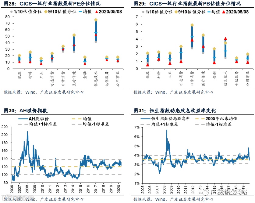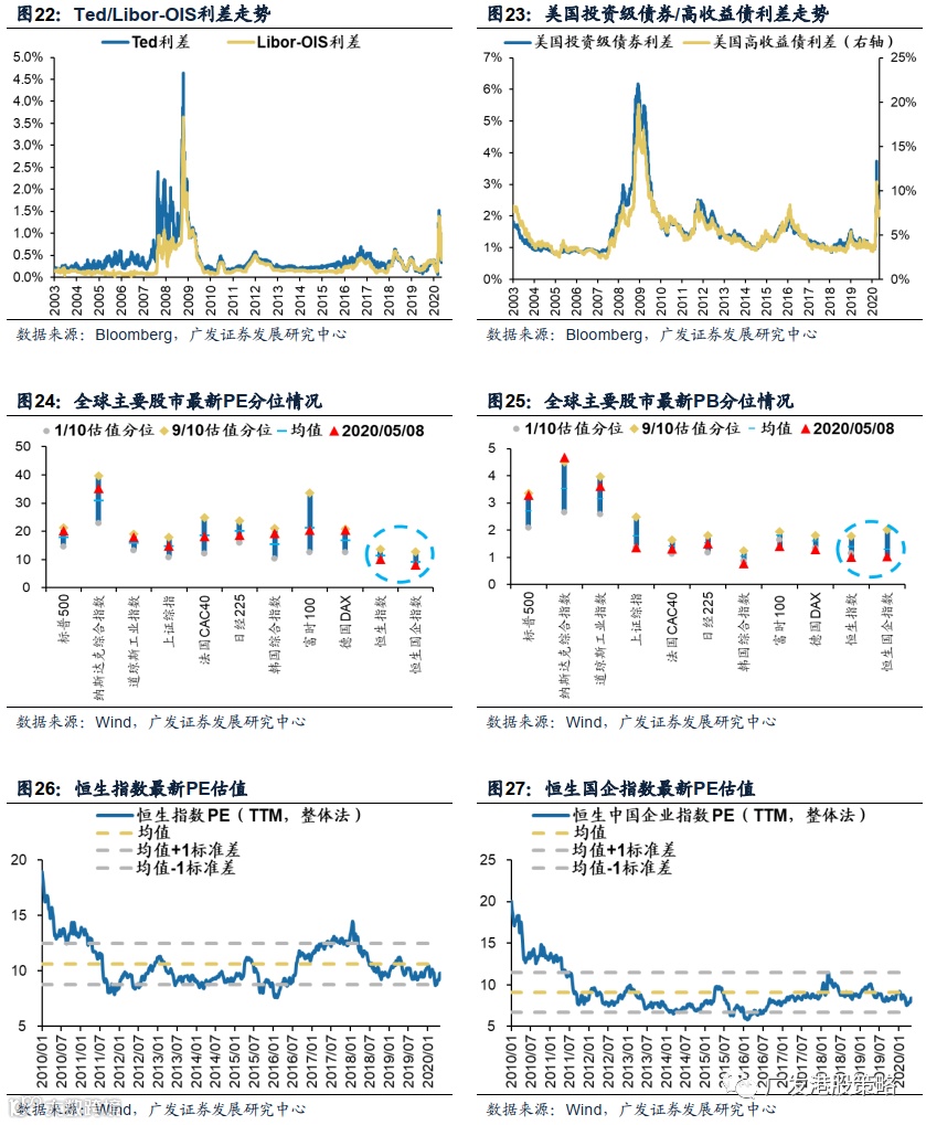 投资策略:5月份港股市场可能迎来更多波动,但估值回调后配置价值仍较为突出。欧美复工后的疫情长尾风险仍然存在,加上低油价影响,需要关注因债务违约“压力测试”、经济衰退和盈利下修带来的海外波动风险。在美股动态PE估值快速修复至历史上限之后,我们认为其将从“快跌快涨”的模式转入“绵绵细雨”,或对港股产生阶段性干扰。但港股极低的估值已隐含了海外“危机模式”和基本面下行的悲观情景,经历暴跌之后伴随利多因素的“积少成多”,若出现估值回调后则无必要过度悲观。