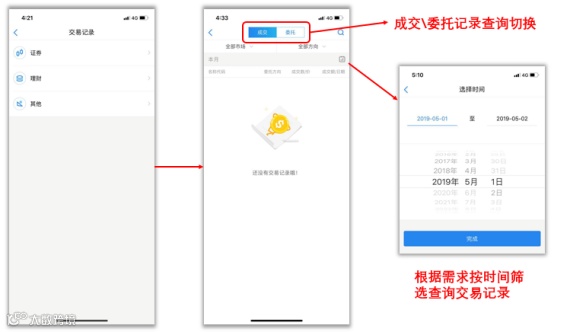 该功能主要提供用户进行金融产品的交易记录查询,包括证券、理财及其他。用户可根据需求,按成交\委托、市场、交易方向、交易时间等条件进行筛选查询。