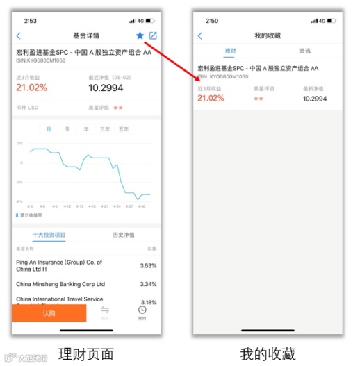 该功能主要是提供用户对感兴趣的理财或资讯进行收藏并方便查阅。在理财或资讯页面,点击右上角的星号按钮收藏该页面,随后即可在我的收藏界面随时查阅历史收藏理财或资讯。