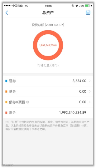 用户可通过总资产功能了解不同业务的投资分布以及盈亏浮动比例,方便用户随时掌握资产动态以便作出下一步投资调整。其中当前界面中右上角出现的账面结余,可直接跳转至“交易 ”主界面,查看持仓及开战便捷交易。