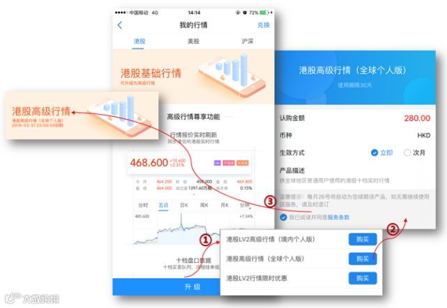 用户进入我的行情界面后,可在顶部标签栏自由切换市场,同时每个市场的界面均设有升级行情后的详细数据介绍,用户可一目了然每个市场行情尊享功能。另外,底部将悬浮一个升级按钮,用户可随时点击升级按钮,弹出升级的行情套餐,可根据个人需求选择套餐后进入购买页面,购买页面将会有认购金额生效日期扣费日期等详细信息,用户在阅读详尽后再选择下一步购买即可。成功升级完毕后,获取的行情套餐将会在返回上一级行情页面有所提示。