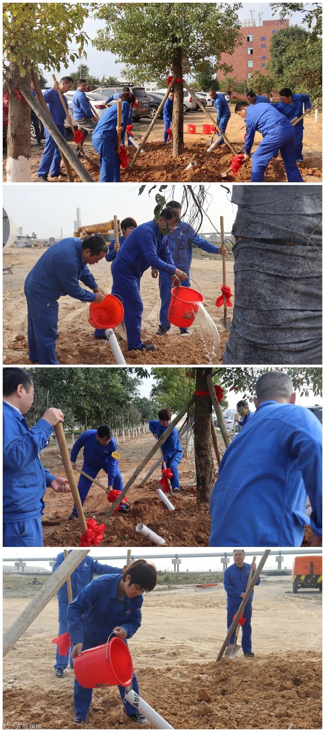 一派植树繁忙的景象在春日里蔚然成风,整个植树节活动中,参与植树活动的人员分工有序团结协作,挥锹铲土、扶正树苗、填入树坑、堆起围堰,浇水定植,认真完成每一道工序。