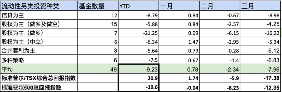 以股票为重点的市场中性基金、多/空基金和多策略基金的个别回报率存在显著差异,但这些基金的平均跌幅仅相当于标准普尔500指数和TSX指数跌幅的三分之一左右。尽管在2月20日的抛售开始之际,每只基金的头寸都是独一无二的,但那些持有增持现金、做多美元的基金,减少做多,或采用了保护性期权策略,都为投资者控制了下行风险。