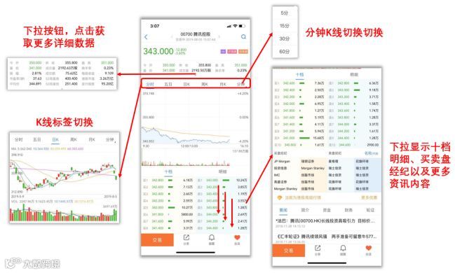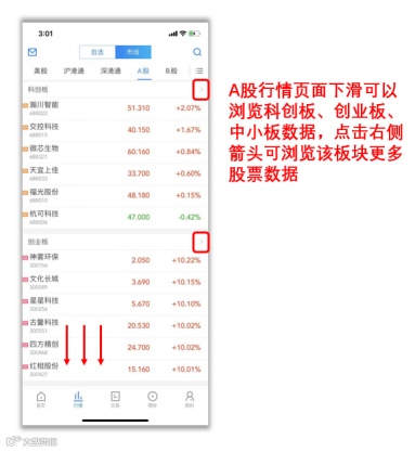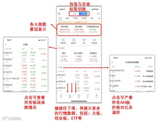 (涵“自选股”行情、“市场”行情、“个股”行情)
