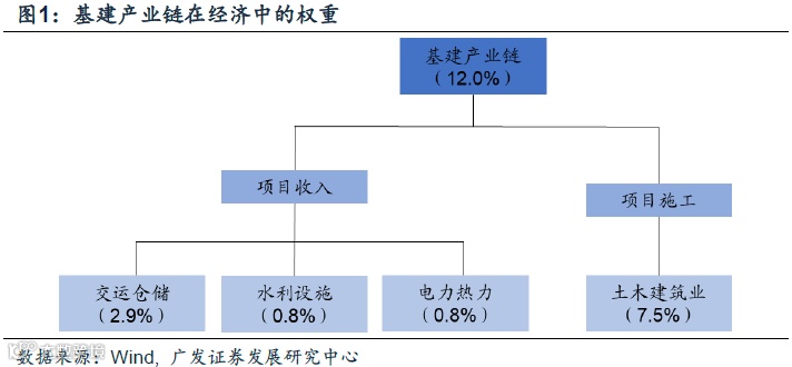 根据2017年GDP核算中的支出法数据,基建的三个行业在GDP中权重分别为2.9%,0.8%,0.8%,土木建筑业占比为7.5%,合计12.0%。这也是整个基建产业链在经济中的权重。