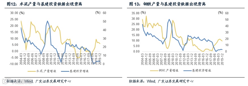 16-18年的基建周期中,宏微观数据有一定程度背离。我们看到宏观指标快速下降而上市公司数据仍然平稳,,微观指标如挖掘机销量、钢铁、水泥产量一度比较活跃。基建投资完成额这一指标的数据有效性在2018年之后可能有所降低。这也印证了前面我们所说的统计制度改革与数据挤水分带来的影响。