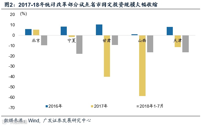 2017年,统计局发布了《关于开展2017年固定资产投资统计制度方法改革试点工作的通知》,在山西、河北、甘肃等20个省市开展投资统计改革试点工作,以财务支出法逐步取代形象进度法。这本质上是一个统计数据挤水分的过程,部分统计改革试点省市的固定资产投资规模也在这段时间出现大幅收缩。2018-19年,投资统计改革再度加快。