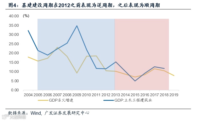 2012年之前,基建建设周期表现出明显的逆经济周期特征,而2013之后则更多地表现为顺周期。我们常说基建是逆周期调控的重要工具,指的是在政策层面,基建政策往往在经济下行期发力;但从政策出台到相关行业的产值创造需要一个过程,如项目立项与审批、招标设计、建设施工、竣工与运营等一系列相对复杂的步骤,因此政策的逆周期并不一定意味着基建建设本身的逆周期。2012年之前,基建建设周期表现出明显的逆经济周期特征,而2013之后则更多地表现为顺周期。
