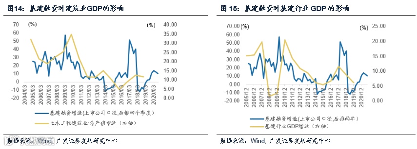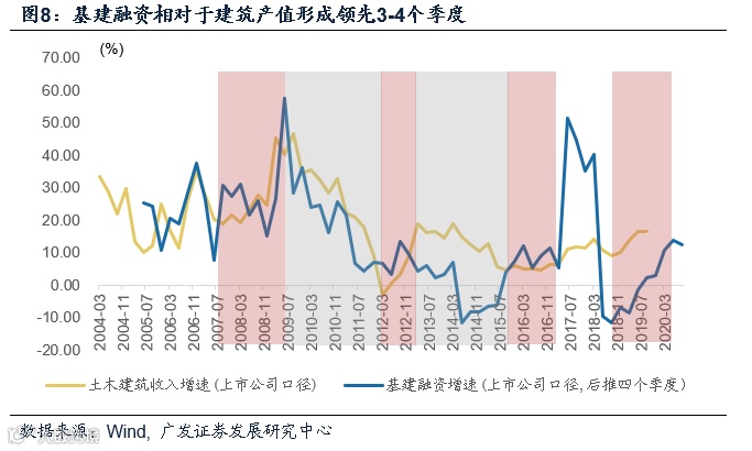 基建的施工周期大约滞后于融资周期3-4个季度。基建项目从立项、融资、审批到开始施工建设需要一个过程,从基建融资到形成建筑收入和产值(也就是创造GDP),大约需要3-4个季度,且随着基建周期的轮回演变,这一时滞在逐渐拉长。