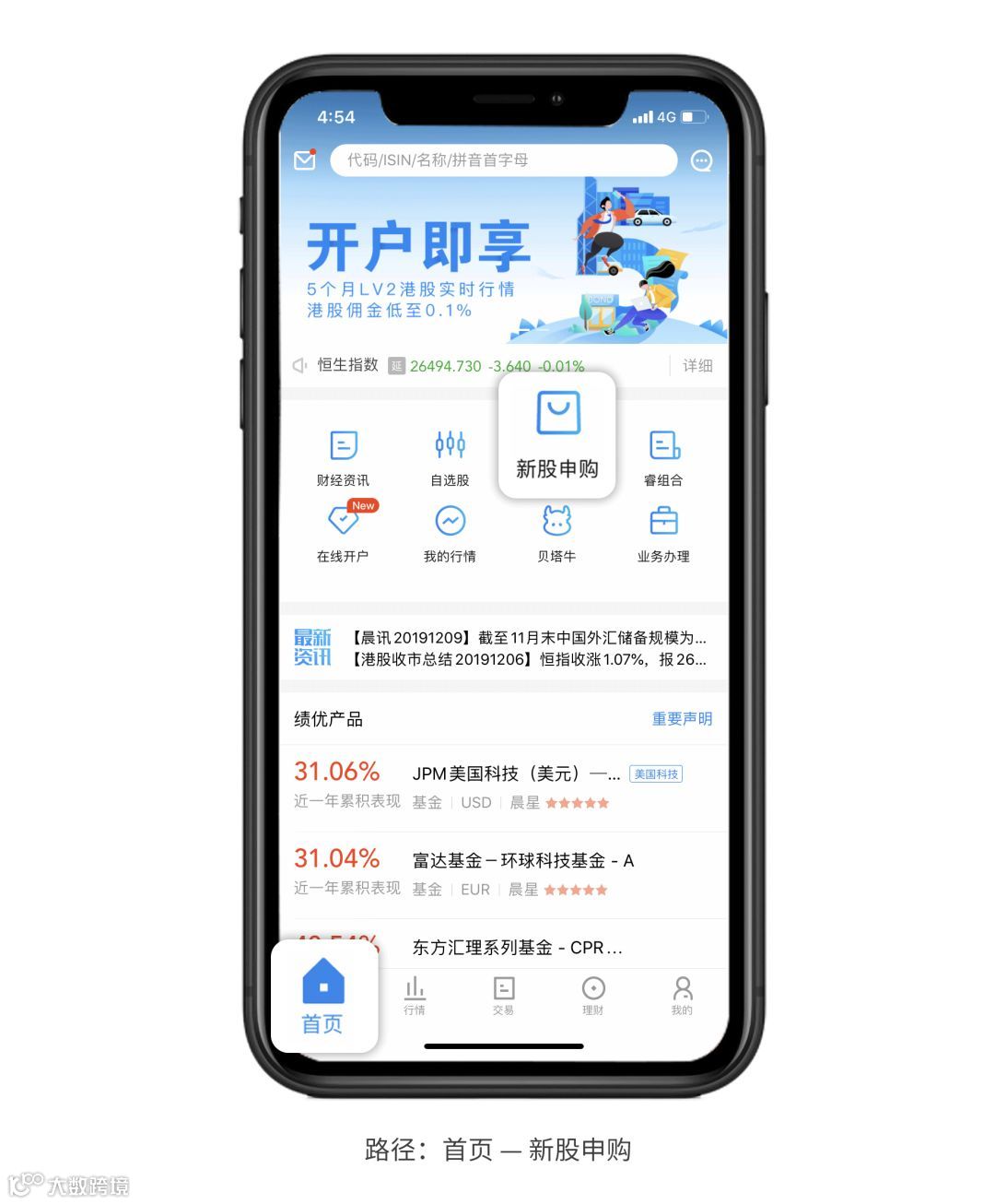 进入“易淘金国际”APP,登录个人交易账户,在APP首页界面的上方,点击选择“新股申购”,进入新股申购页面。