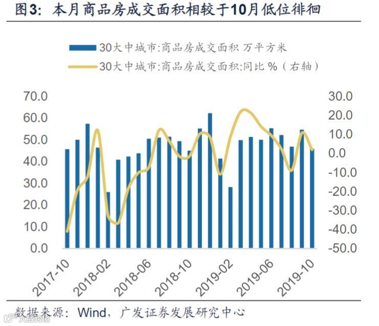 2.从商品房成交数据观察:截止11月27日,全国大中城市商品房日均成交面积录得49.3万方,同比转负-10.8%,相较10月读数4.4%进一步趋缓。前三周数据表现(-9.1%,-2.2%,-9.6%)亦较上月(28.0%,-5.5%,17.9%)有所回落。近期货币政策进入以稳增长为导向的“碎步宽松”阶段,OMO、LPR利率密集下调侧面印证当前房价并无过热风险。后续地产弱势震荡趋势是否延续有待观察。