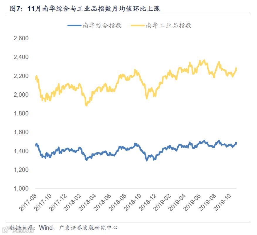 1.螺纹钢期货价格反弹,截止11月27日收于3913元/吨,环比上月末上涨11.9%。动力煤期货价格小幅上涨,截止11月27日收于551.8元/吨,环比上月末上涨0.2%,同比数据大致平稳并持平于季节性。铁矿石期货价格小幅回落,截止11月底收于667.5元/吨,较10月略有回落。伴随国内工业原材料价格整体强势,南华综合指数和南华工业品指数月均值环比上涨1.3%和0.7%,同比数据录得双位数增长。