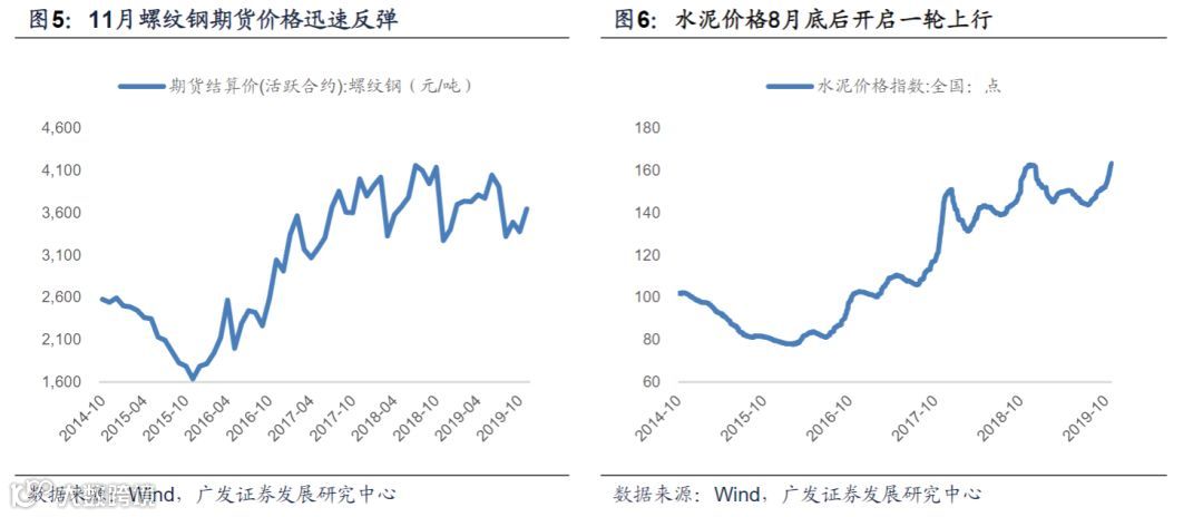 3.水泥价格11月份延续强势,目前地产施工增速仍在相对高位,竣工上升,基建回升预期也在形成。截止11月26日,全国水泥价格指数录得163.2,较10月底上涨6.6%。玻璃价格指数延续8月以来上行趋势,截至11月26日录得1221.0,较10月上涨0.8%。微观上观察本月建材价格上行加速或与冬季环保限产有关;但从时间来看,8月底开启的这轮上行与本轮基建项目审批、地方财政支出节奏基本匹配,应部分反映基建的开工预期。此外地产竣工以及新开工链条原材料价格均相对强势,后续水泥价格的斜率亦是我们观察地产竣工景气持续与否的关键变量。11月13日,国务院常务会议进一步健全固定资产投资项目资本金管理政策,促进有效投资加强风险防范,基建增速回升预期或将进一步确认。