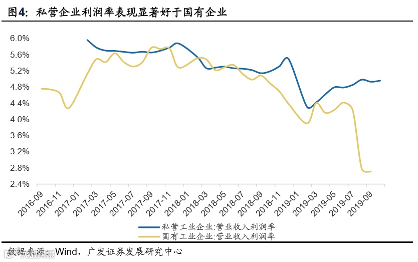 1-10月国有企业利润增速由-9.6%下降到-12.1%,与此同时私营企业盈利仍然维持5.3%的正增长(上期为5.4%)。如果从营业收入利润率来看,2018Q2以来私营企业利润率持续高于国有企业,特别是今年下半年以来这一分化显著加剧。