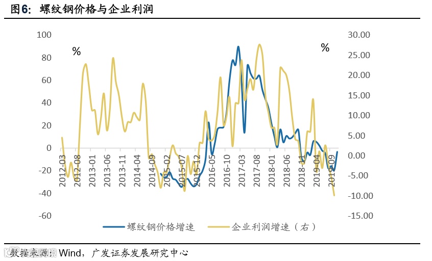 库存增速继续下移至0.4%,进一步靠近经验底部。从11月工业品价格环比特征看,10月有较大概率是PPI底,那么年底前后会确认库存底部。我们可以从原油、螺纹钢与企业利润的同步变化回顾这轮库存周期及企业盈利周期(图5、图6)。