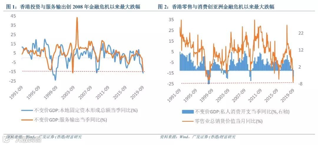 本地事件在短期内仍是影响港股走势的最大变量。香港的社会风波目前持续时长已经超过五个月,对香港经济造成了显著冲击:继第二季度负增长后,第三季香港GDP继续下行,按季下跌3.2%,按年下跌2.9%,全年经济增长被进一步下调至-1.3%;投资和服务业遭到重创,零售指标更是创下了亚洲金融危机以来的最差表现(图1、2)。虽然香港政府的抒困措施以及施政报告所出台的惠民举措能起到一定提振作用,但若当前状况持续,营商情绪低迷、投资信心不振、消费需求萎靡的问题将无法从根本上得到解决,叠加全球经济下行导致整体需求疲软,香港经济短期内或难以走出泥潭。