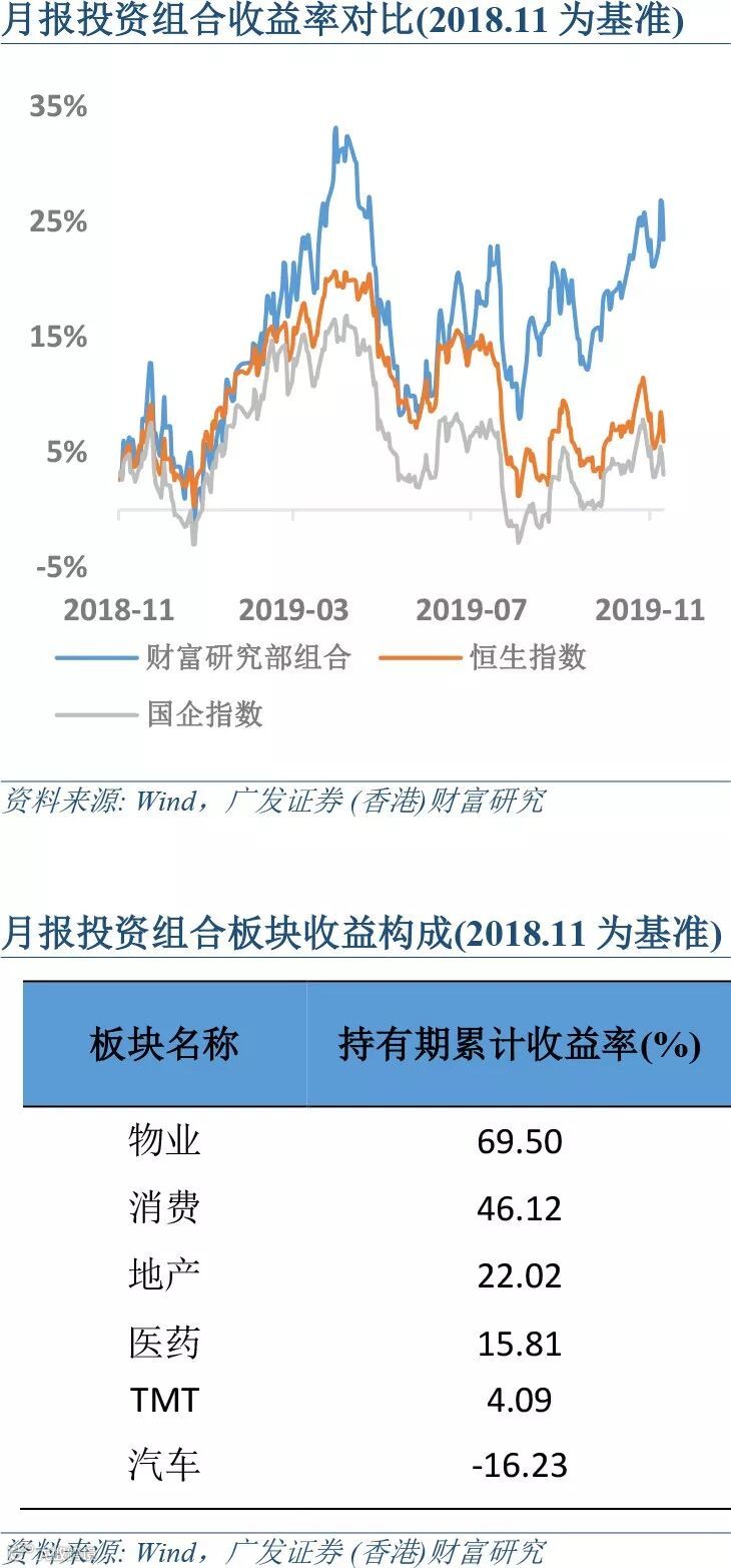 组合表现:我们自2018年11月开始推荐的月报股票投资组合当前累计收益率为23.48%(已考虑交易时点和税费),跑赢同期恒生指数的5.95%与国企指数的3.07%。