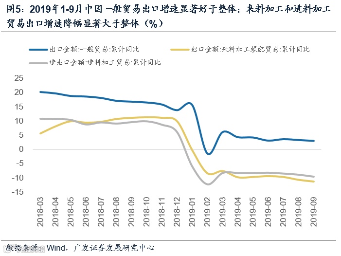2019年1-9月中国一般贸易出口增速为3%,要显著好于整体。来料加工和进料加工贸易出口增速分别为-11.3%和-9.6%,降幅显著大于整体。两种加工贸易的进口增速也较弱,预示后续加工贸易出口也不会太好。加工贸易的变化在2019年比较明显,我们理解驱动因素之一是贸易环境的变化。关税加征的大环境下,出口制造企业的成本变得更为敏感,加工贸易的利润率较低,将进一步加快萎缩。随着加工贸易的比例被动下降,中国出口产业将进一步品牌化、技术化和结构升级。换句话说,此次贸易摩擦将加快中国外向型制造业从劳动力成本驱动转向“工程师红利”驱动的过程。