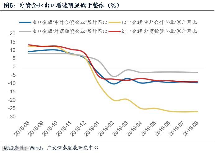 出口数据中,一个值得注意的现象是外资企业出口增速明显低于整体,这可能和产能转移有关。今年前8个月,中外合资经营企业、中外合作经营企业、外商独资企业、外商投资企业的出口累计增速分别为-9.5%、-26.8%、-3.3%、-9.0%。