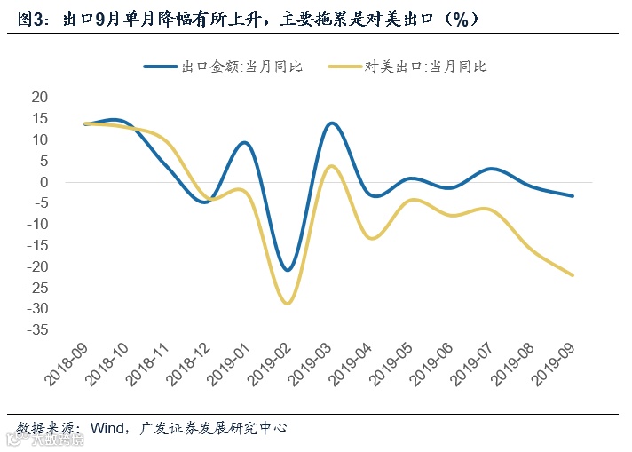 第二,9月单月降幅有所上升,主要拖累是对美出口增长-22%,跌幅扩大应主要源于3000亿相关商品加税。我们估计若3000亿商品关税不取消,其影响明年一季度达到最大;但考虑基数下台阶,同比降幅大致可控。